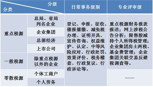 站在分类分级管理这个整体框架下,为适应“放管服”相结合的征管要求,在整体和分类分级管户相互促进的关系上把握和发挥好各税源管理机构的职能。因此,笔者认为必须进一步厘清征管职责,对重点税源强化数据分析和税源监控,实行精细化管理;对一般税源管理强化计税收入和纳税申报管控,实行差别化管理;对零散性税源,强化委托代征、代扣代缴制度,实行源头化管理。